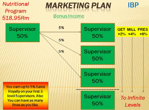 Infinite level bonus – This refers to the Tabulator Team Bonuses (Production Bonus). For example the President Team earns an additional 2% on the business they have built. Effectively Herbalife, from their half of the money from sales, set aside 2% of the retail value of all products sold. This 2% is taken up the sponsorship line and given to the first qualifying President Team member. There is no limit on how far this goes so if there are 101 layers of sponsorship between the sale and the first President Team member then it is taken there. (In Herbalife that separation is rarely more than 5 or 6 layers.